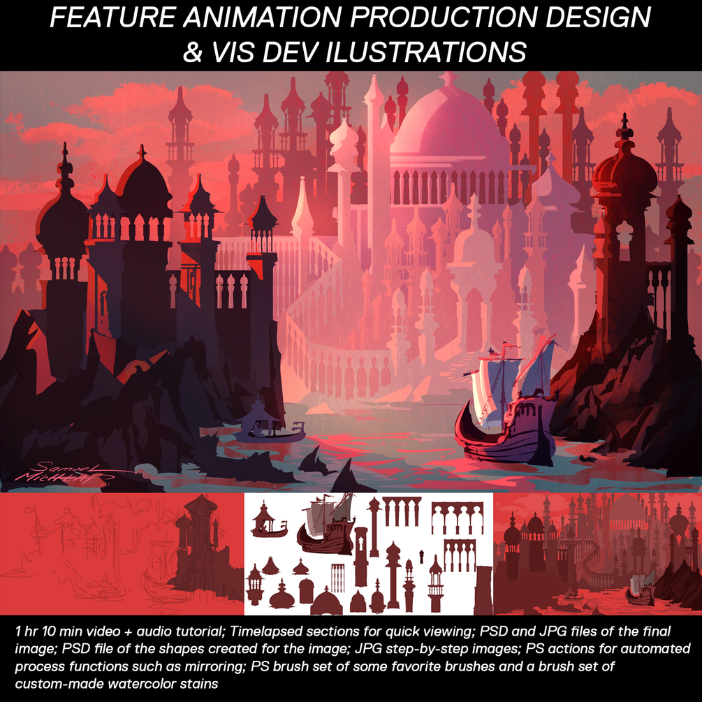 Using the setting of an Oriental harbor, this tutorial covers one tried and true way to create feature animation production design and vis dev illustrations. Using the included materials for this package, you also can easily follow along while we work through creating the finished piece for this tutorial. For those interested in a career in animation, this tutorial is especially applicable!