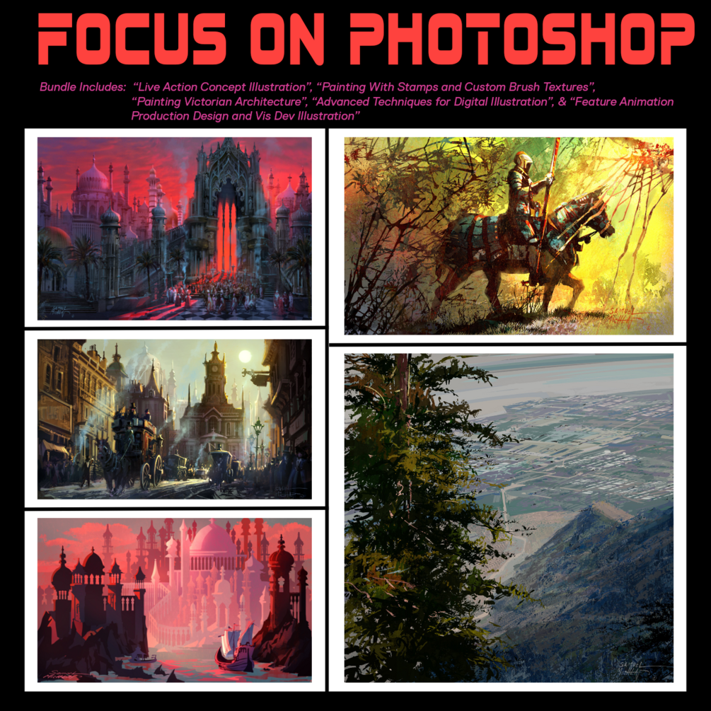In this tutorial, I cover the process for using photos to help you paint complex architecture with cinematic lighting, how to set up color harmonies, how to paint building details with simple methods, and how to place the action in the scene and add your dramatic light.